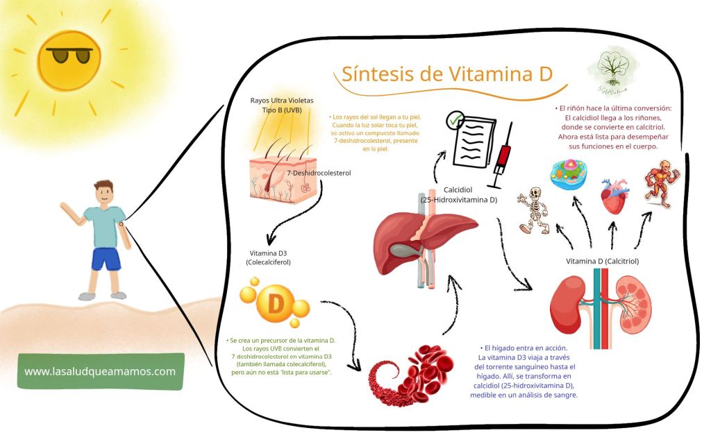 Los rayos ultravioletas tipo B (UVB) interactúan con una molécula derivada del colesterol en tu piel, transformándola en Vitamina D3 (o colecalciferol, si te pones técnico). Esa vitamina viaja por la sangre, pasa por el hígado, y termina en los riñones donde se convierte en la forma activa: la Vitamina D, o más formalmente, el calcitriol. ¿Qué hace el calcitriol, igual te preguntas? Bueno, resulta que tiene poderes bastante impresionantes